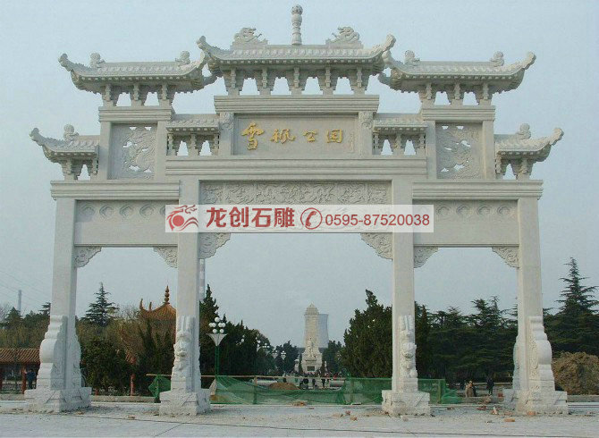 门楼牌坊雕刻的样式,门楼牌坊设计时没有楼的构造,既没有斗拱和屋顶,而门楼牌坊设计时有斗拱和屋顶,它有更大的烘托气氛。但是由于它们都是我国古代用于表彰、纪念、装饰、标识的一种建筑物,而且多用于主要街道起点、交叉口、桥梁,古代多用于宫苑、寺观、祠堂、衙署等处,景观性很强,起到点题、框景、倩景等效果,长期以来老百姓对“坊”、“楼”的概念不清,所以到最后两者成为一个互通的称谓了。牌坊石雕、石雕牌坊、牌坊,现在很多石雕厂为了利益把石雕之本已经抛弃了,他们建造的门楼牌坊都是为了应时之景,雕刻工艺粗糙,已经徒有其表,门楼牌坊原本的神采和韵味乃至意义都不复存在。