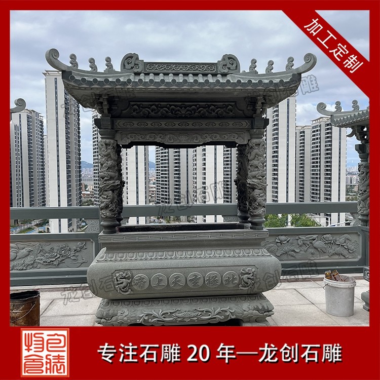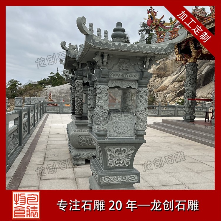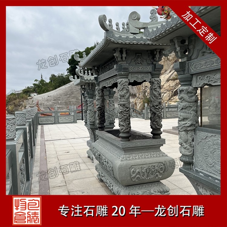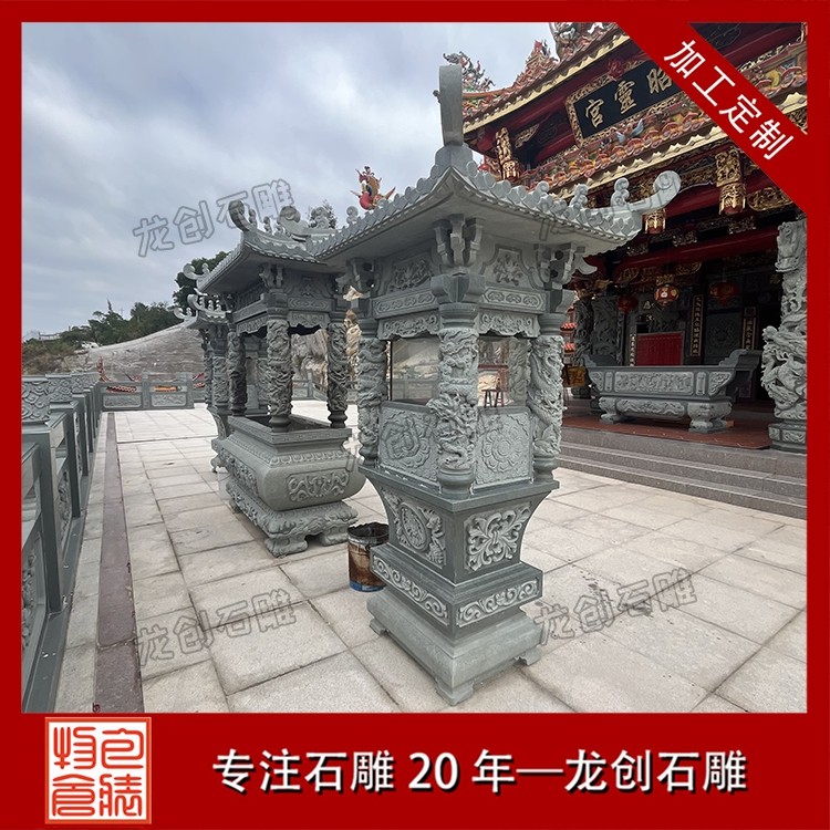 石雕香炉,以天然青石、花岗岩为原料,经传统工艺精雕而成,是寺庙、祠堂、陵园及道观中祭祀礼佛的经典器物。
